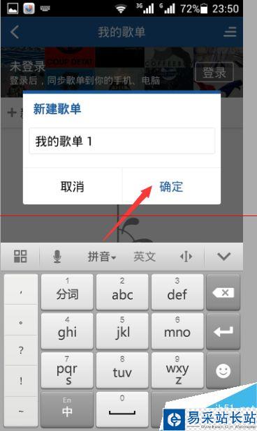 3、點擊后彈出一個對話框,你可以輸入歌單的名字,根據你的需要起個名字即可,輸入后,點擊”確定“按鈕。