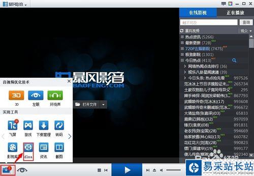 2、打開剛剛安裝的“暴風影音”,單機右下角的“工具箱”圖標,然后單機里面的“dlna”。(這一步之前就可以打開電視,并且開啟電視的DLNA功能了)。