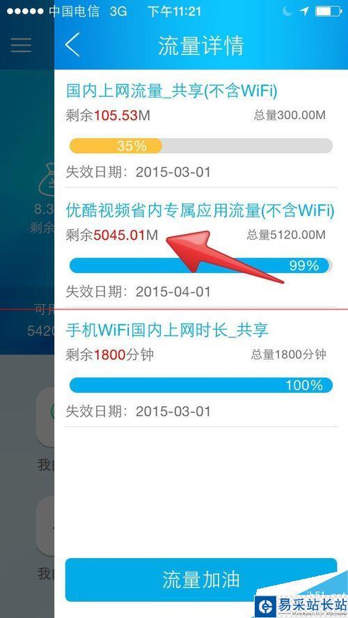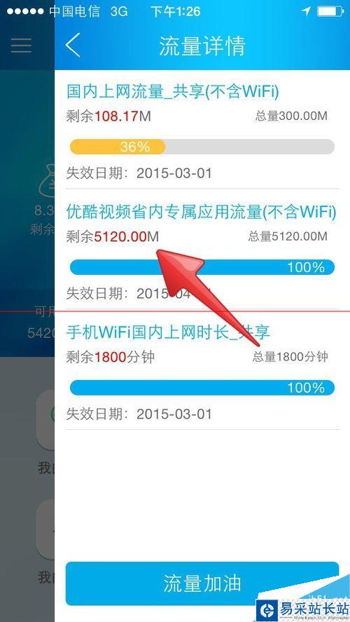 4、優酷視頻播放完了之后,點擊流量客戶端進行查看,可以看到,剛剛用的流量,只是扣的你的優酷視頻省內專屬應用流量,你的國內上網流量不變。此時完成優酷視頻省內專屬應用流量的使用及查看。