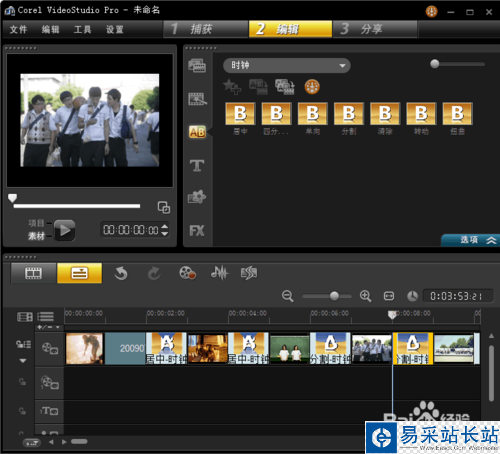 2、點擊轉場按鈕---收藏夾---時鐘,然后選擇第一個時鐘效果