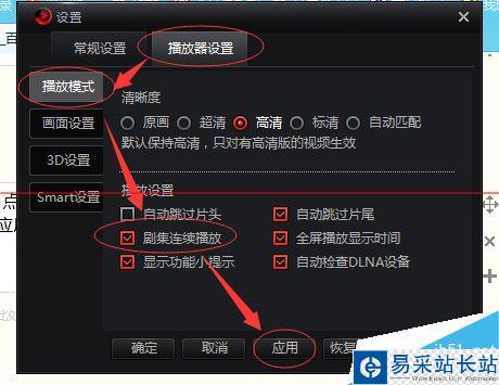 3、在【設置】界面下,點擊選擇【播放器設置】-->【播放模式】-->勾選【顯示功能小提示】-->【應用】選項完成操作。(如圖所示)
