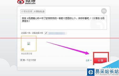 7、如果想把你喜歡的那首音樂分享給自己的小伙伴們,就點擊分享按鈕,會跳出很多分享站點可選,比如選擇新浪微博,然后進入分享頁面,點擊分享即可,也可以加上幾句話哦。