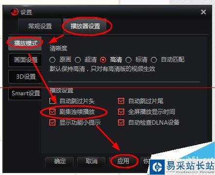 3、在【設置】界面下,占擊選擇【播放器設置】-->【播放模式】-->勾選【劇集連續播放】-->【應用】選項完成操作。(如圖所示)
