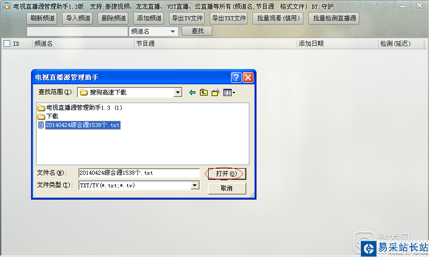 3、點擊上邊的“導入頻道”,在蹦出的對話框選擇你需要檢測的電視源txt文件或者TV文件。