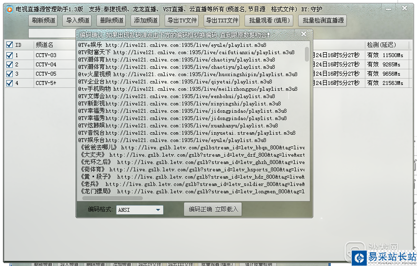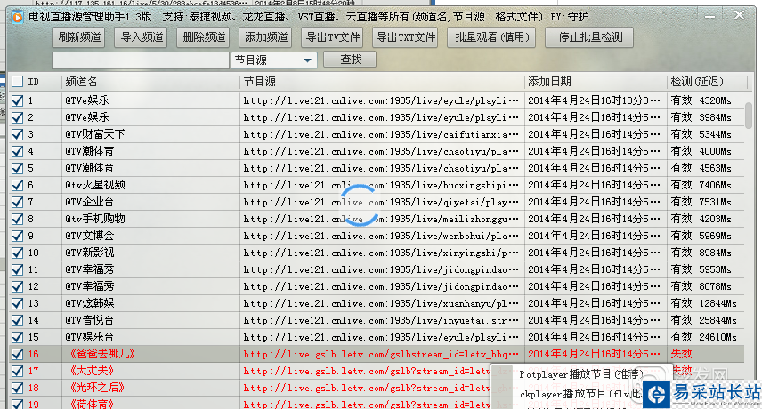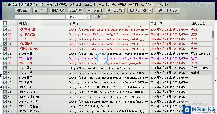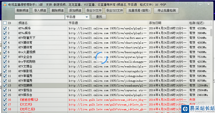 4、單擊確認正確,立即導入。然后點軟件界面頂部最后的“批量檢測直播源”,就ok了。程序會自動檢測出所有的有效源和無效源。