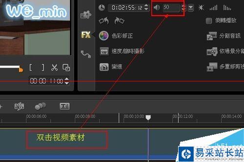 5、這時我們要整體試聽一下,感受一下視頻原聲和錄制的旁白聲音大小是否合適,如果視頻原聲過大蓋過了旁白的聲音,那就需要進行一下調整。雙擊視頻素材,會打開一個選項面板,里面小喇叭圖標的位置是視頻的聲音音量,默認是100,最大是500,現在我們把它設置小一些,調成50.