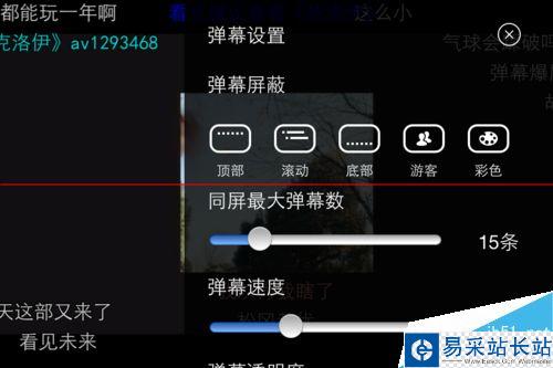 4、點擊齒輪,可以設置彈幕的數量,速度,透明度等。上面一列是屏蔽屏幕上那一部分的彈幕的設置。