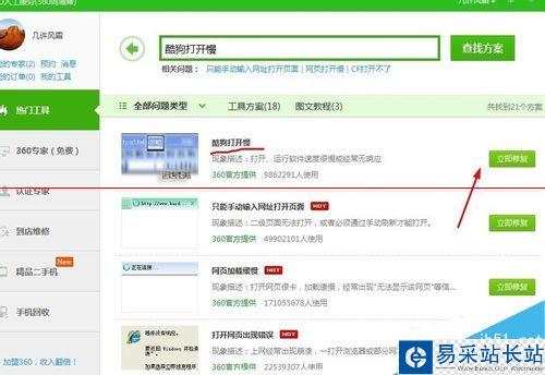 5、點擊一下查找方案后,就到了這里。我們選擇:酷狗打開慢,再點擊一下立即修復,如下圖箭頭所示: