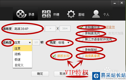 一般,最高只能錄制高清384P視頻,而且有水??;加入拍大師超級VIP,可以錄制超清視頻,還可以除去水印、高保質錄音。你還可以設置錄制播放音、錄制麥克風、錄制鼠標、第三語音軟件優先。還可以調接視頻亮度。設置好了,點擊確定。