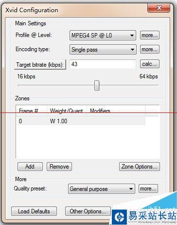 最后,我們點擊“導出視頻”按鈕,在“導出設置”對話框內,點擊“AVI/MPEG4壓縮器”一欄“Xvid壓縮器”右側的“設置”按鈕。在彈出的設置框內,我們只需切換到“Target bitrate(kbps)”模式,然后調小視頻的比特率。你可以向左拉動滑桿,滑桿越往左,比特率就越小,體積也就越小了。
