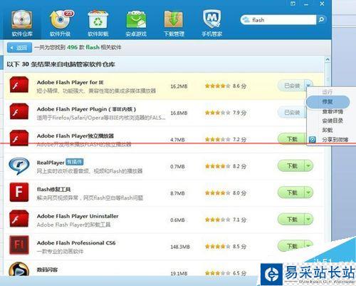 1.打開【電腦管家】→點擊【軟件管理】,在搜索框中輸入"flash"→找到相應版本點擊【安裝】或【升級】(如果以安裝請點擊下箭頭后選擇修復,如此步驟無法成功修復,可繼續執行第二步驟再進行此步驟)