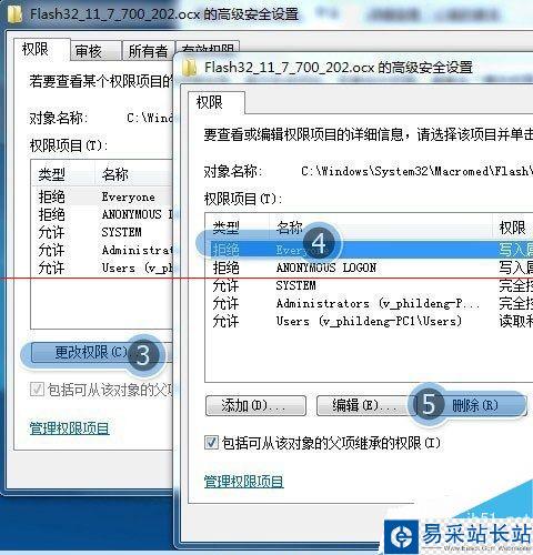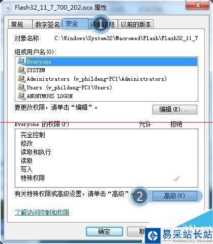 2. 打開文件夾C:/Windows/System32/Macromed/Flash將名為"Flash32_版本號.ocx" 文件刪除(如果無法刪除請右鍵文件點擊【屬性】→【安全】→【高級】→【更改權限】→將前兩項拒絕權限刪除后點擊【確定】后,再將QQ、騰訊電腦管家、瀏覽器關閉后即可刪除文件):