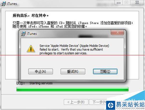 升級了itunes,結果安裝后一直提示apple mobile device service fail to start!從網上搜索并嘗試了所有的方法例如:刪除所有與apple有關的軟件再重新安裝、解壓安裝包逐個安裝、從計算機管理服務器中手動打開apple device、修改apple mobile device support注冊表等等各種方法均以失敗告終!如果大家出現這種情況,又著急用itunes,不妨試試這個辦法。