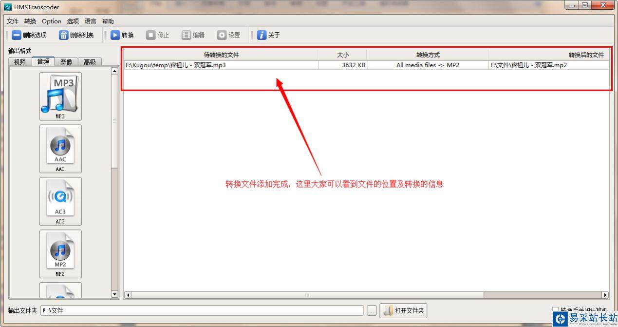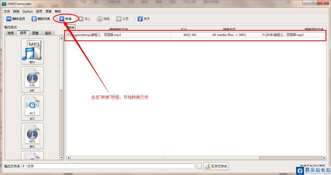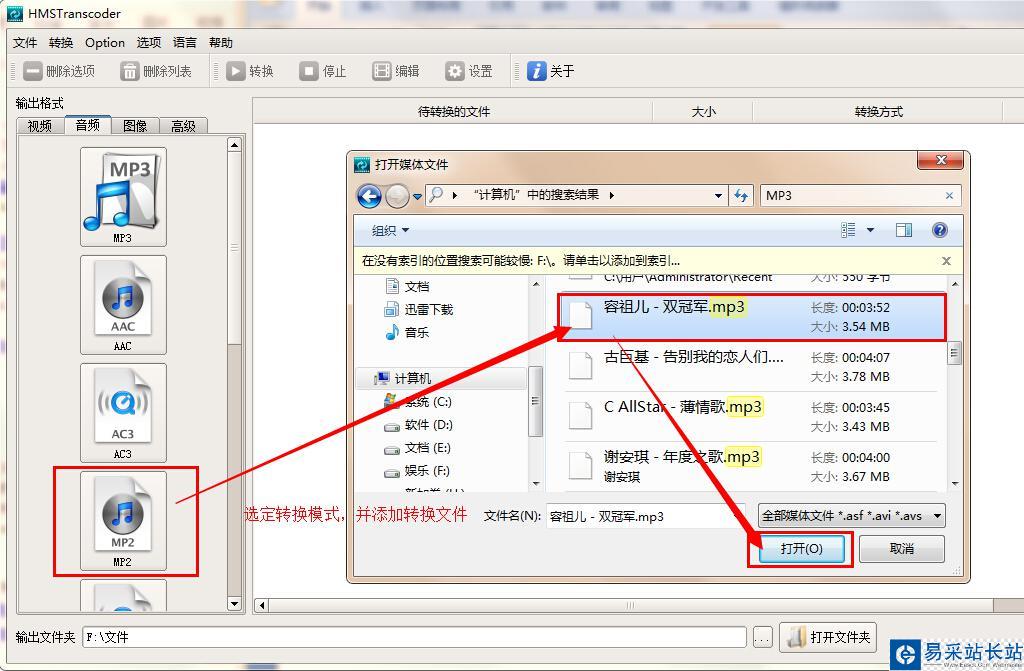 3、這里我們以MP3文件為例,將其轉換成MP2格式。點擊軟件左側音頻列表下的“MP2”按鈕,在打開的窗口中找到需要轉換的MP3文件,選定,然后點擊“打開”按鈕,轉換文件添加完成。