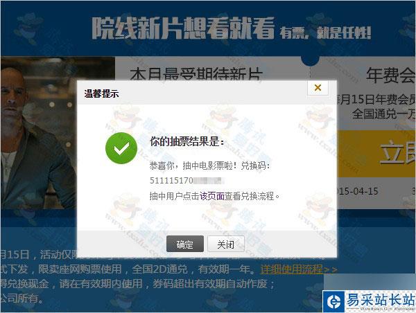 小編今天運氣貌似還不錯,活動開啟時抽到電影票了【價值28元RMB】。如下圖: