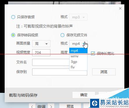 4、點(diǎn)擊保存,打開保存設(shè)置對(duì)話框。選擇要保存的格式,文件名稱和保存地址后點(diǎn)擊確定按鈕,開始保存。