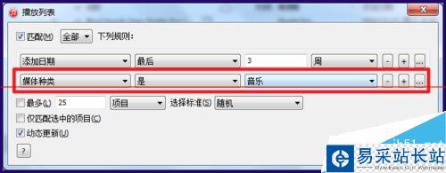 10、點(diǎn)擊第一個(gè)規(guī)則后面的【+】,就可以再添加一個(gè)規(guī)則,設(shè)置如下,選擇【媒體種類】為【音樂(lè)】,這樣只有音樂(lè)才能顯示在這個(gè)播放列表內(nèi)了