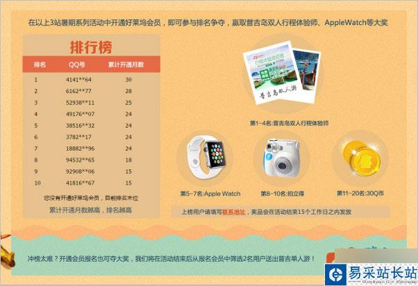 2. 活動(dòng)結(jié)束后,根據(jù)開(kāi)通好萊塢會(huì)員的月份數(shù)排名,第1-4名的用戶將獲得普吉島雙人游資格,第5-7名名獲得Apple Watch Sport一臺(tái),第8-10名獲得拍立得一臺(tái),第11-20名獲得30Q幣,上榜用戶請(qǐng)?zhí)顚?xiě)個(gè)人信息,活動(dòng)結(jié)束后15個(gè)工作日內(nèi)會(huì)將獎(jiǎng)品寄到您填寫(xiě)的地址,數(shù)碼獎(jiǎng)品的參數(shù)配置以最終收到的實(shí)物為準(zhǔn),如因個(gè)人信息缺失而無(wú)法獲得獎(jiǎng)品,不予補(bǔ)送;