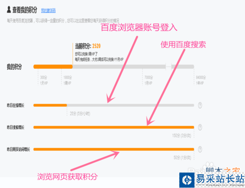 3、積分獲取:1,使用百度瀏覽器。2,使用百度搜索。3,但進入其他網頁也能獲取積分哦(注意:要是你用瀏覽器不登賬號,不僅不會給你積分,積分還會一天天消失的)