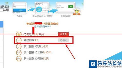 3、進入到簽到頁面我們可以看到提示我們今天已經成功簽到了,首簽即賺3天,累計簽到3天賺1-3天,累計簽到15天賺3-15天,累計簽到30天賺31天