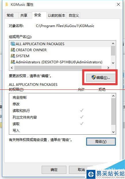 8、從打開的“kugou屬性”窗口中,切換到“安全”選項卡,點擊“組和對象”欄目中的“編輯”按鈕。