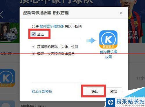 3、接著從打開的“酷狗音樂播放器-授權管理”窗口中,勾選“全選”項,點擊“確定”按鈕。