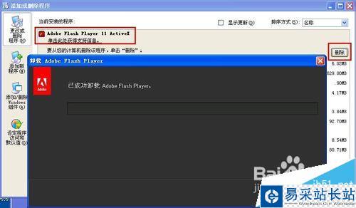 2、在當前安裝的程序框中找到并選擇Adobe Flash Player項,單擊“刪除”按鈕,接下來根據提示說明卸載即可