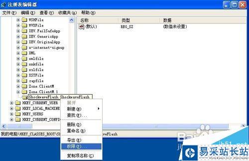 10、接著再定位到HKEY_CLASSES_ROOT/ShockwaveFlash.ShockwaveFlash項,鼠標右擊ShockwaveFlash.ShockwaveFlash項,打開的右鍵菜單單擊“權限”命令