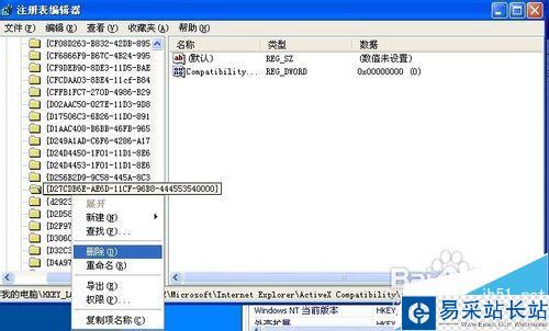 7、在ActiveX Compatibility主項下刪除掉“{D27CDB6E-AE6D-11CF-96B8-444553540000}”和“{D3f97240-C9f4-11CF-BFCr-00A0C90-00A0C90C2BDB}”子項