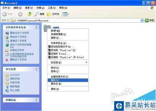 4、在打開的目錄窗口鼠標右鍵刪除“Flash”文件夾