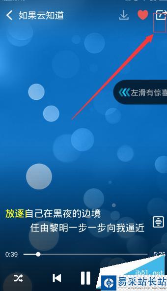 4、選定歌曲之后,我們?cè)谙旅娴牟シ诺母枨厦纥c(diǎn)擊下,出現(xiàn)歌曲歌詞的界面,并且我們看到在歌曲播放的詳細(xì)信息界面的右上角有一個(gè)分享按鈕。