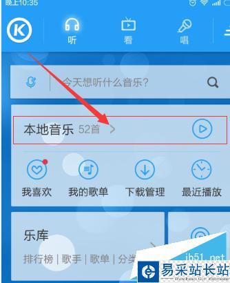 2、打開進(jìn)入手機(jī)酷狗的主窗口后,這里我們?cè)谥鞔翱谡业讲Ⅻc(diǎn)選本地下載的歌曲,因?yàn)楸镜馗枨话闶俏覀冏约合矚g的,當(dāng)然大家也可以重新選擇下載。