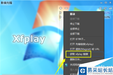 從打開的播放列表中右擊要下載的視頻文件,從彈出的擴展面板中選擇”獲取xfplay磁鏈“項。