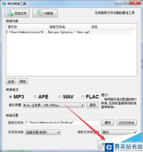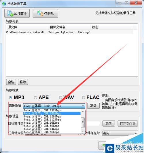 3、只需壓縮歌曲文件大小的話,我們只需點擊如圖所示選項條,然后根據自己的需要選擇文件大小,比如80kbps,一般來說,數字越小,文件越小,當然音質也越差