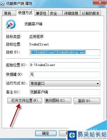 1、在桌面上的優(yōu)酷客戶端單擊右鍵,出現(xiàn)快捷菜單,單擊左鍵選擇“屬性”
