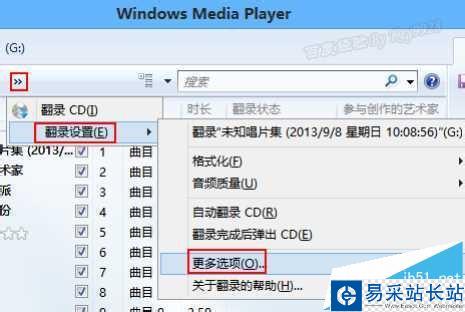 3、單擊最右邊“>>”,選擇“翻錄設置”下的“更多選項...”: