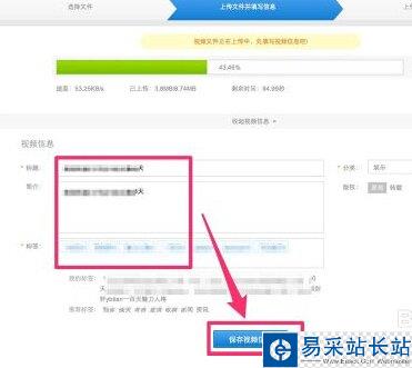 6、視頻文件會自動載入網頁并開始上傳,在視頻上傳的進度條下方,填上視頻的標題、分類、簡介等信息,填寫完畢后,找到頁面底部的“保存”按鈕點擊完成操作。
