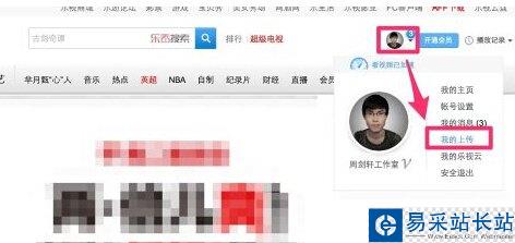 2、找到自己在樂視首頁中的個人頭像,然后點擊一下,從下拉菜單中找到“我的上傳”這一欄并點擊進入下一步。
