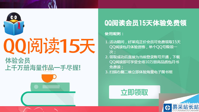 正價好萊塢會員可免費領取qq圖書vip15天資格。