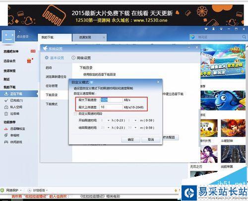 6、設(shè)置好相應(yīng)的上傳及下載速度后,點(diǎn)擊確認(rèn),關(guān)閉設(shè)置窗,完成整個配置,在點(diǎn)擊邊下邊播,基本上是400kb/s,看1.4G以內(nèi)的視頻不卡頓。下載時長低于電影總共時長就不卡頓。