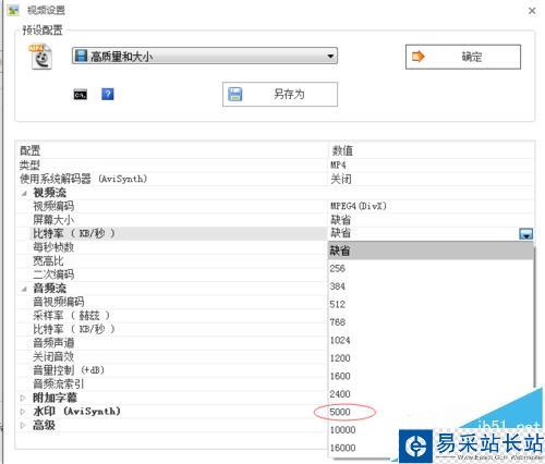 5、我們現在已經完成了前兩個步驟,那么還有最后一個步驟,就是這個比特率問題,由于優酷要求的是5Mbps,所以我們根據進率:1Mbps=1000Kbps,所以得出的是5000Kbps,所以我們選擇5000Kbps,如果你選擇下面的10000Kbps也是可以的,不過體積會比較大一些