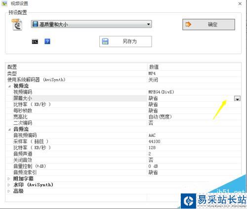 3、那么接下來大家會看到這樣的一幅圖,大家先單擊“屏幕大小”項,你的格式工廠可能沒有那個小三角形,此時你只要單擊“屏幕大小”項旁邊的缺省就可以了