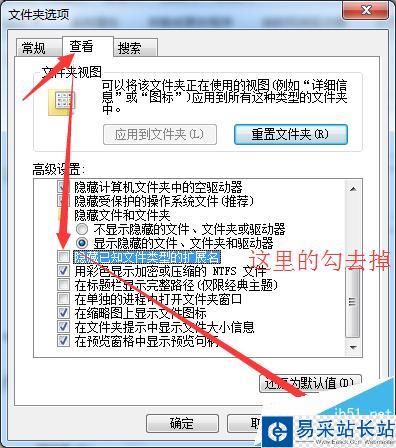 2、查看>隱藏已知文件類型的擴展名 - 去掉 勾