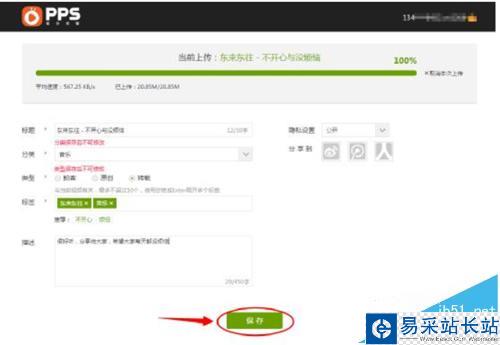 7、當顯示當前上傳為100%時,我們按照提示把標題,分類,類型,標簽帶星號的必填一下,確認無誤后點擊保存