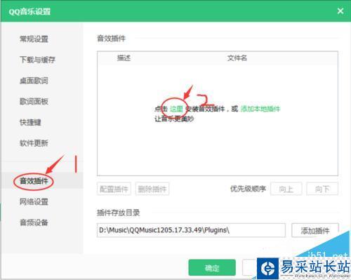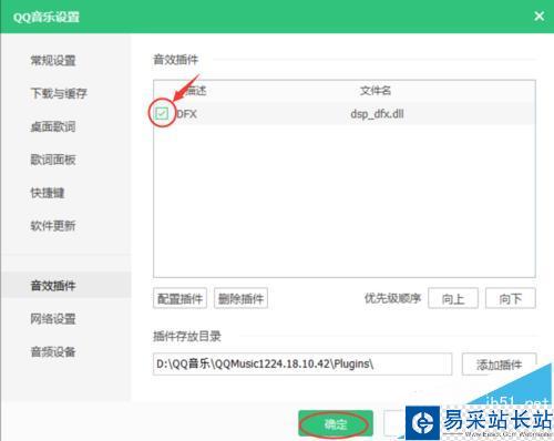 6、安裝完成后,再打開QQ音樂,重復步驟一和步驟二,打開音效插件列表,在這里你就可以看到你已經安裝好的插件了。選中你要使用的音效插件,然后點擊確定。