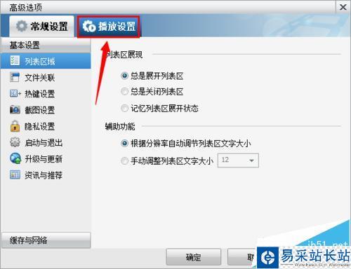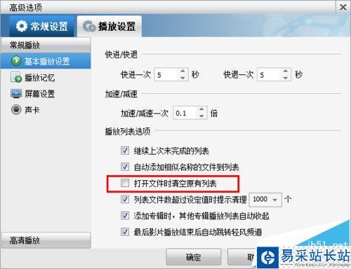 4、在播放設置界面,在播放列表選項欄中,找到“打開文件時清空原有列表”取消對勾,如下圖所示。
