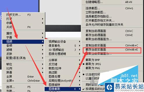 2、在視頻選項卡里面,把鼠標(biāo)先移動到【圖像截取】,然后再選擇【截存當(dāng)前實畫面】這一項。在【截存當(dāng)前實畫面】的后面有一個Ctrl+Alt+E的快捷組合鍵,這就是potplayer視頻截圖快捷鍵!