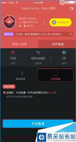 2、進入斗魚直播伴侶應用的主頁面之后,就可以看到在頁面中間新增的兩個選擇框——“橫屏直播”和“豎屏直播” ,“橫屏直播”就是各位手播主播已經很熟悉的戶外直播形式,而“豎屏直播”就是本次更新的全新功能。選擇“豎屏直播”,再點擊“開啟直播”按鈕進入下一步。