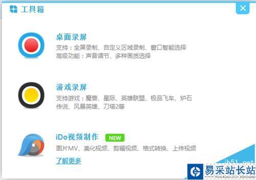 3、打開工具箱之后,你能看到一個桌面錄屏工具和一個游戲錄屏工具。桌面錄屏支持全屏錄制、自定義區域錄制、窗口智能選擇、聲音調節、多畫質選擇功能;游戲錄制支持游戲:魔獸、星際、英雄聯盟、極品飛車、爐石傳說、風暴英雄、刀塔2等。