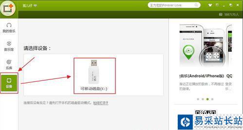 這時候我們需要準備一個U盤或者一臺Android手機,反正可以當U盤存儲的設備都可以。把U盤插上電腦,QQ音樂播放器可以識別到U盤存儲即可。這是我們要在QQ音樂播放器面板中,切換到設備窗口,可以看到QQ音樂播放器已經識別到U盤存儲了。